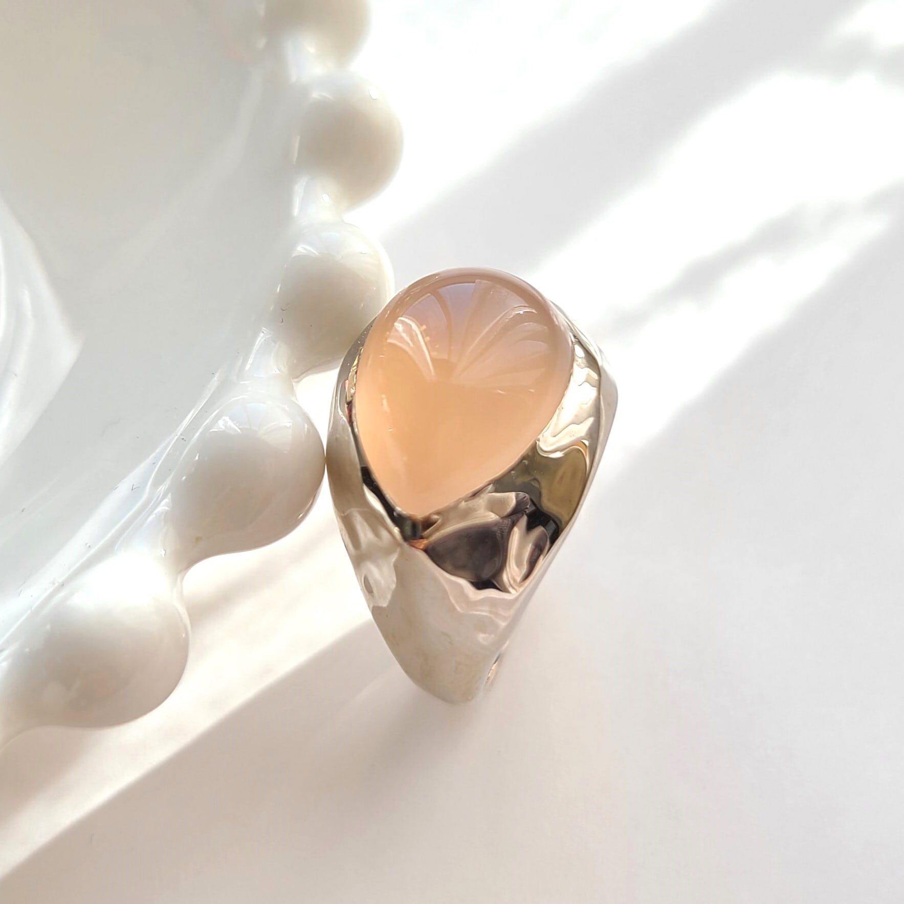 大ぶりペアシェイプのピンクカルセドニーの優しい色味と